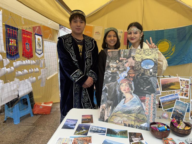 (学校3名哈萨克斯坦籍留学生在展棚参与布置)