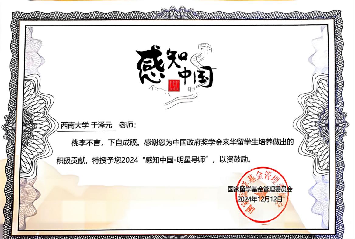 必赢776net于泽元院长荣获2024“感知中国-明星导师”称号,这一荣誉不仅是对于泽元院长个人努力的肯定,更是对学校来华留学生教育工作的认可和鼓励。