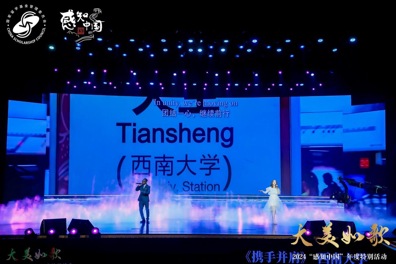 活动在2024年“感知中国”回顾视频中拉开帷幕。来自北京大学、清华大学、复旦大学等15所高校的中国政府奖学金生代表通过演讲、情景展示、歌舞等形式分享了他们参加“感知中国”活动的收获和体会。学校赞比亚籍国际学生GIFT MUYUNDA(格福特)携手来自意大利的CATERINA CAZZOLA(左拉)、马达加斯加的ANDRIANJATOVO MIRAY FIFALIANA MIARIMBOLA(梦蝶)和哈萨克斯坦籍的AINURA KUBENOVA(刘月光)共同演唱其原创歌曲《Joining Hands》(《携手并肩》)。这首歌曲以其独特的旋律和深情的歌词,表达国际学生对中国的热爱和对世界和平、共同发展的美好祝愿。