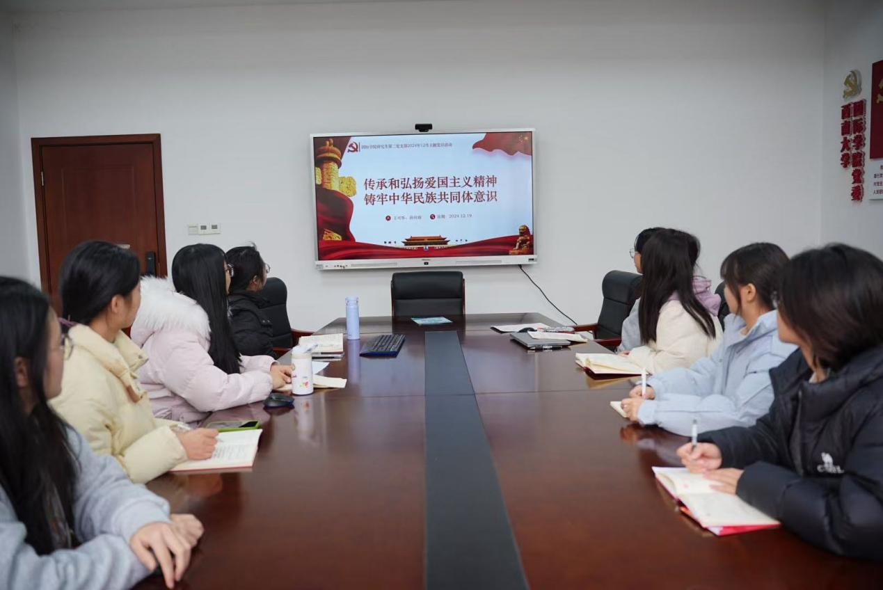 12月19日下午15:00,研究生第二党支部在必赢776net304会议室召开了主题为“传承和弘扬爱国主义精神,铸牢中华民族共同体意识”的党日活动。