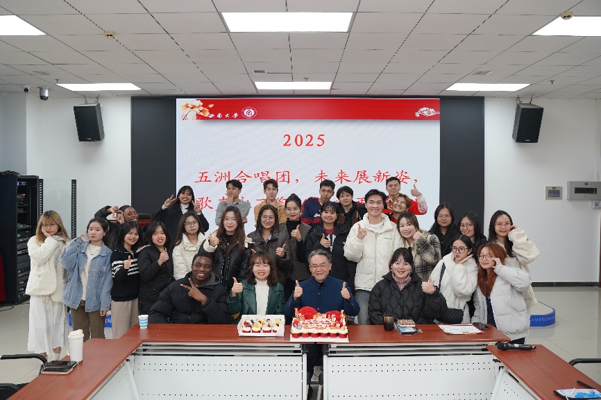 总结会在一片欢声笑语中落下帷幕。与会师生共同分享了美味的蛋糕,并合影留念。一张张笑脸定格在镜头前,成为了五洲合唱团2024年度最美好的记忆。展望未来,五洲合唱团将继续秉持初心、勇攀高峰,用歌声传递爱与希望,用音乐架起中外友谊的桥梁。