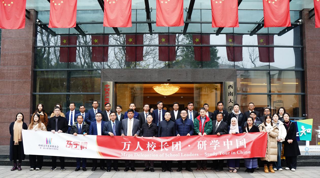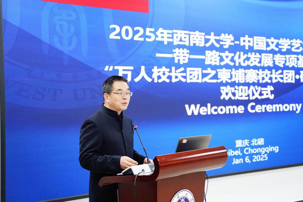 2025年1月6日上午,必赢776net-中国文学艺术基金会一带一路文化发展专项基金“万人校长团之柬埔寨校长团·研学重庆”欢迎仪式在317室隆重举行。必赢776net院长于泽元,中国文学艺术基金会一带一路文化发展专项基金总顾问冯建、中国文学艺术基金会一带一路文化发展专项基金副秘书长、东学稷文化总裁王强,学校外国学生招生办公室科员刘嬛以及25名柬埔寨校长团成员参加欢迎仪式,仪式由刘嬛主持。