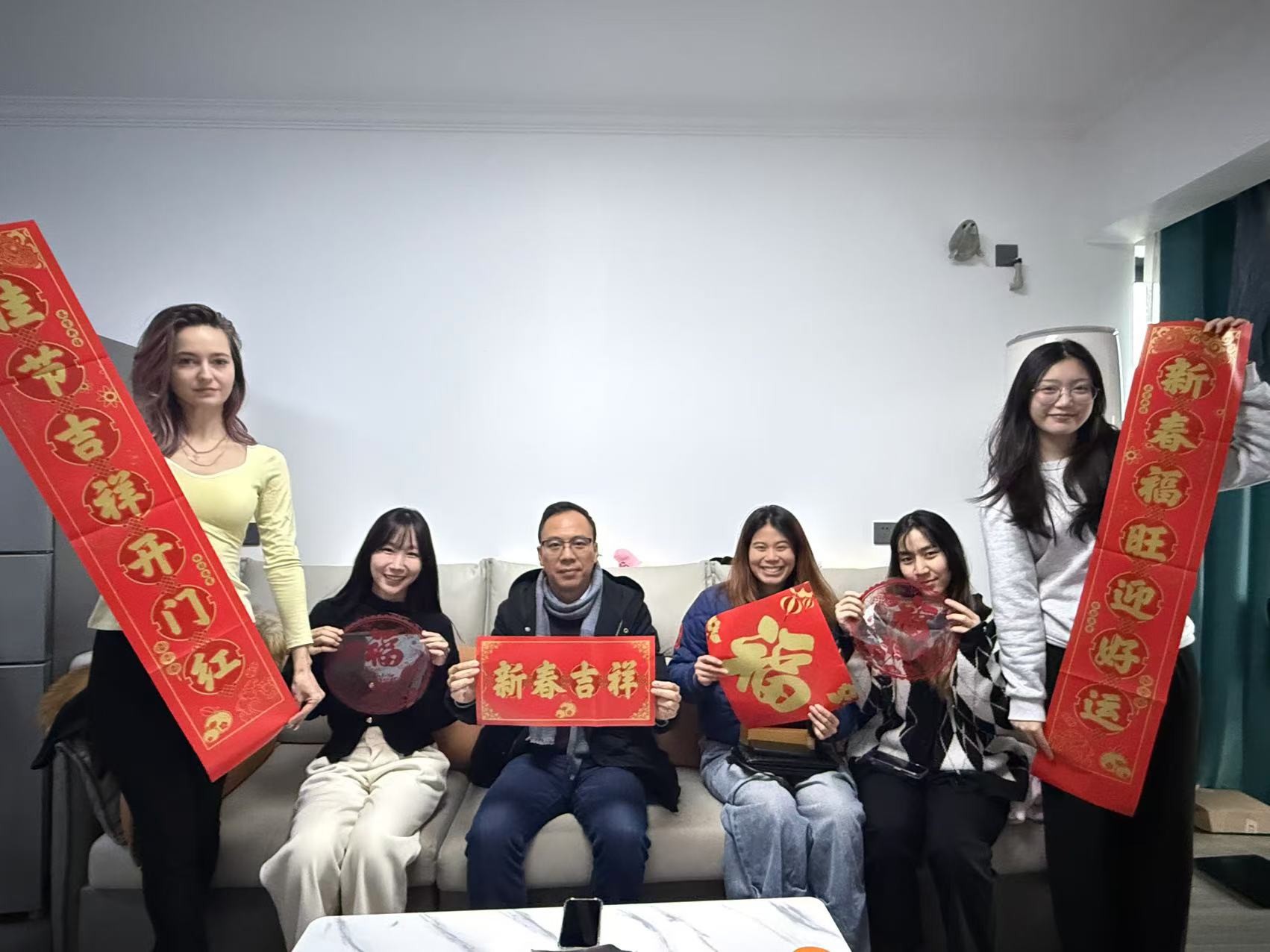 2025年1月8日下午,慰问团队一行带着精心准备的礼物,满怀热忱地开启了此次暖心之行。学院领导特意挑选了具有浓郁中国年味的对联和福字送给学生。这些承载着中华传统文化底蕴的物品,承载着满满的心意,期望留学生们借此深入了解中国春节文化内涵,融入中国节日氛围。
