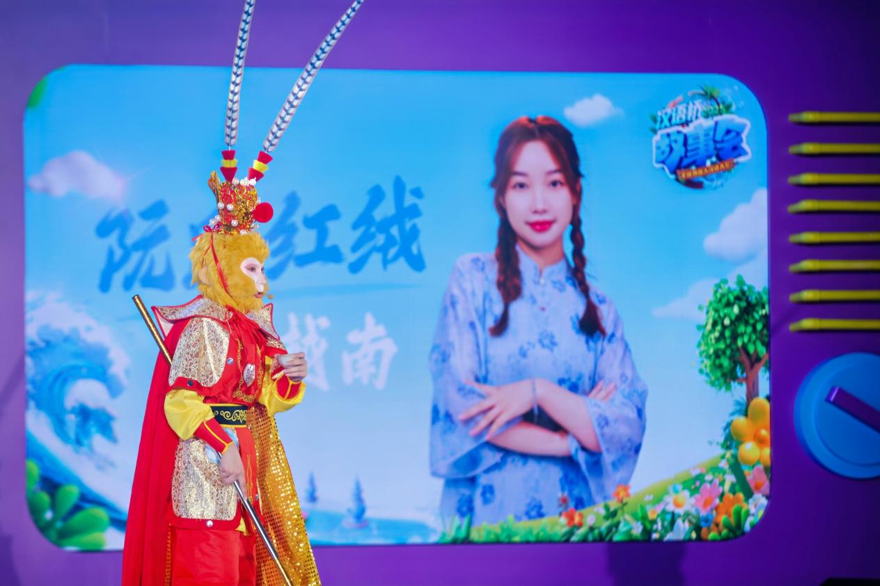 阮氏红绒则以“孙悟空”形象登场,自编自演情景剧《猴哥闹学“汉语桥”·杭州闯关奇遇记》。剧中,“猴哥”从花果山来到杭州,历经西湖迷踪、龙井解语、茶馆奇闻等三关,用幽默的方式呈现留学生视角下的文化误解与顿悟。她巧妙将断桥残雪、白蛇传、茶文化等中国符号串联成一条“文化闯关线”,以轻松的节奏打通语言学习与文化认知的桥梁。最终,阮氏红绒从五十名复赛选手中成功晋级全国决赛。