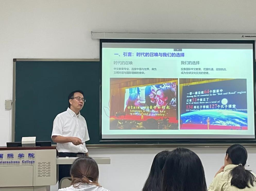 课程伊始,张书记围绕“百年未有之大变局”的复杂背景,阐述了国际中文教育所肩负的文明对话与国际理解的使命。他强调,国际中文教育工作并非局限于语言教学,更在服务教育强国建设、增强中华文化软实力、促进中外务实合作、推动全球教育发展等方面发挥关键作用。基于此,他明确国际中文教师需肩负“双重使命”:一是助力民族伟大复兴,二是推动世界和平发展,并指出唯有肩负这两大使命,才能在新时代中把握机遇、应对挑战。