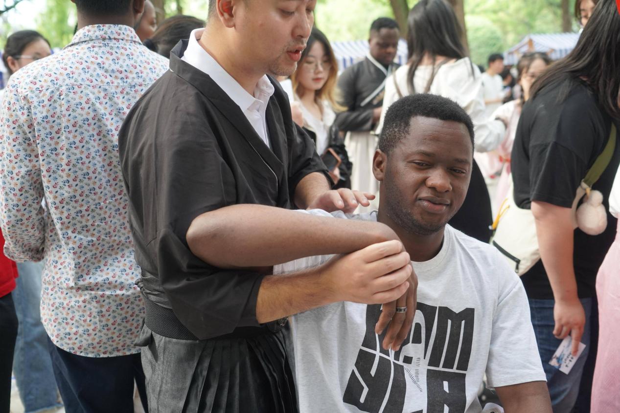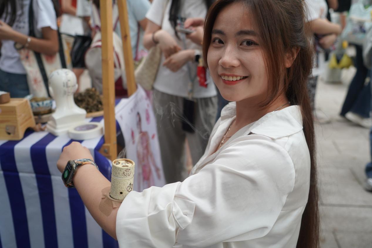 活动精心打造了八大主题沉浸式体验区。“中医口腔馆”,留学生们探索“齿为肾之余”的养生智慧,学习口腔保健与全身健康的关系;“草药香囊铺”延续传统,参与者亲手制作蕴含“芳香避秽、扶正祛邪”理念的香囊;“中医美容铺”展示了中医“以内养外”的美容观,介绍药食同源、经络按摩对肤色的调理;在“中医养眼馆”,体验者了解了“肝开窍于目”的理论,学习眼保健操及养肝明目的食疗方;“中医康复体验铺”则让参与者亲身感受推拿、艾灸、拔罐等非药物疗法舒筋活络、调和气血的功效。此外,新增的“草药辨识区”和“中医义诊区”让大家近距离接触百草,体验“望闻问切”的诊疗智慧,而“传统药具展”则生动呈现了中医药发展的历史脉络。