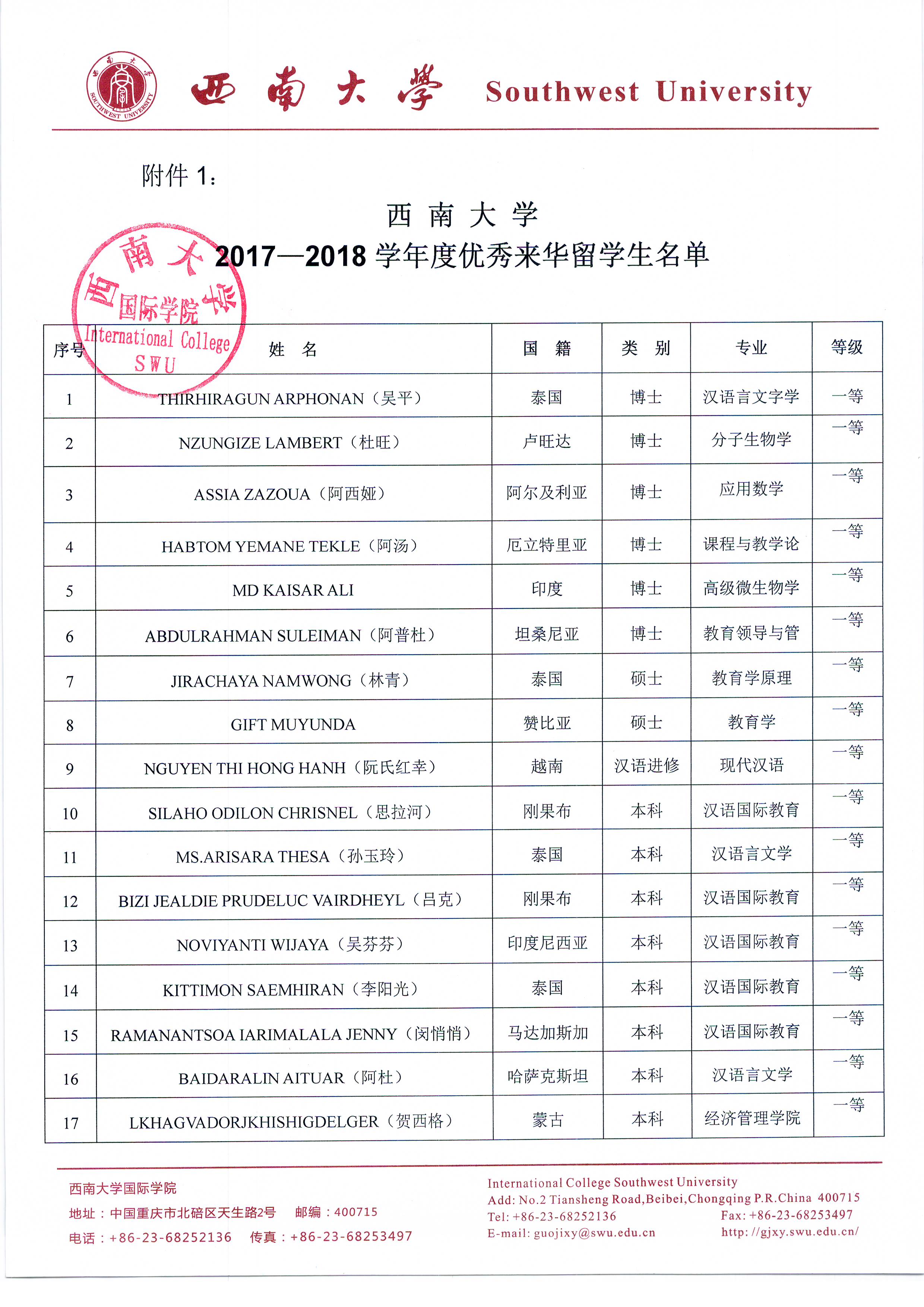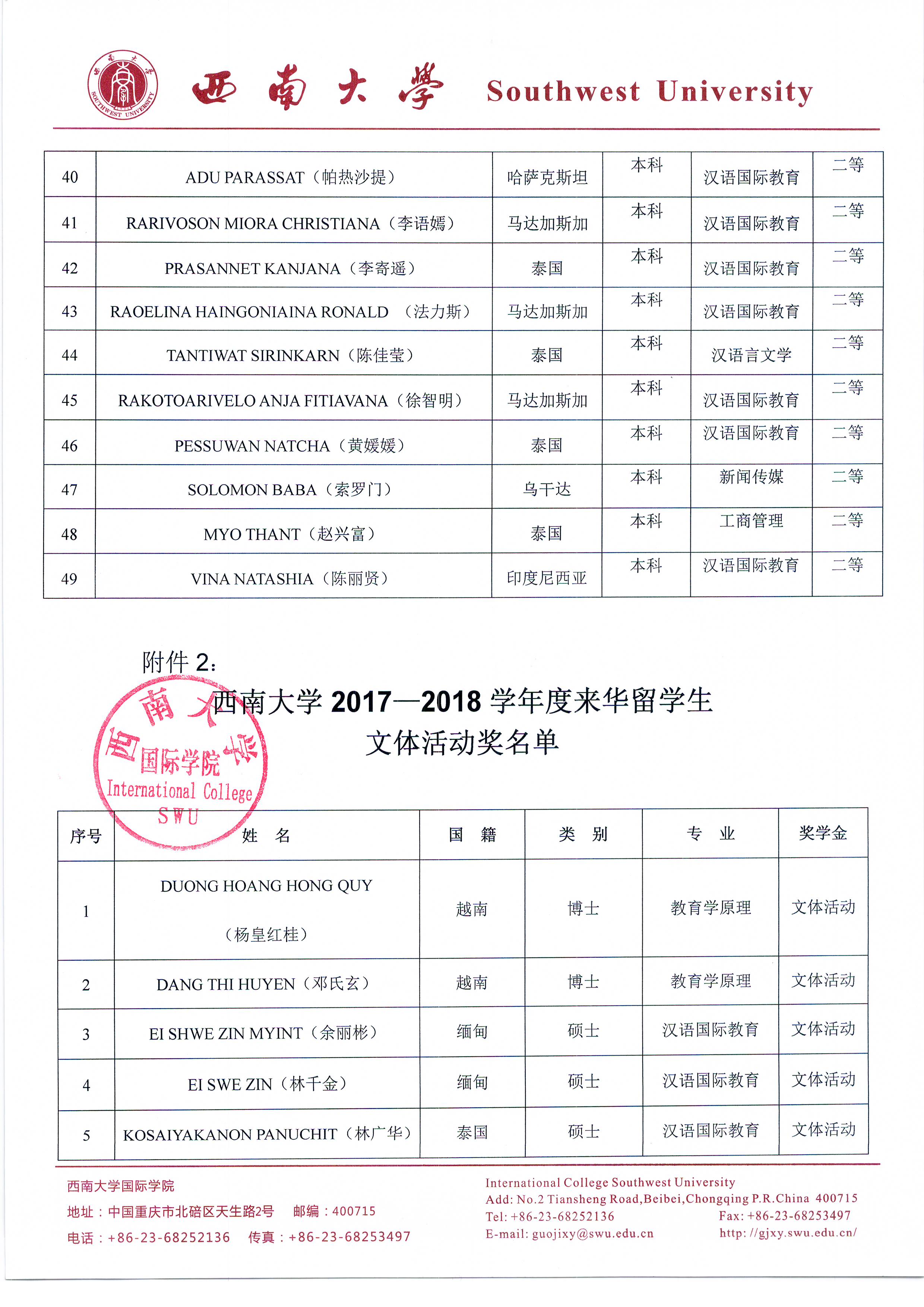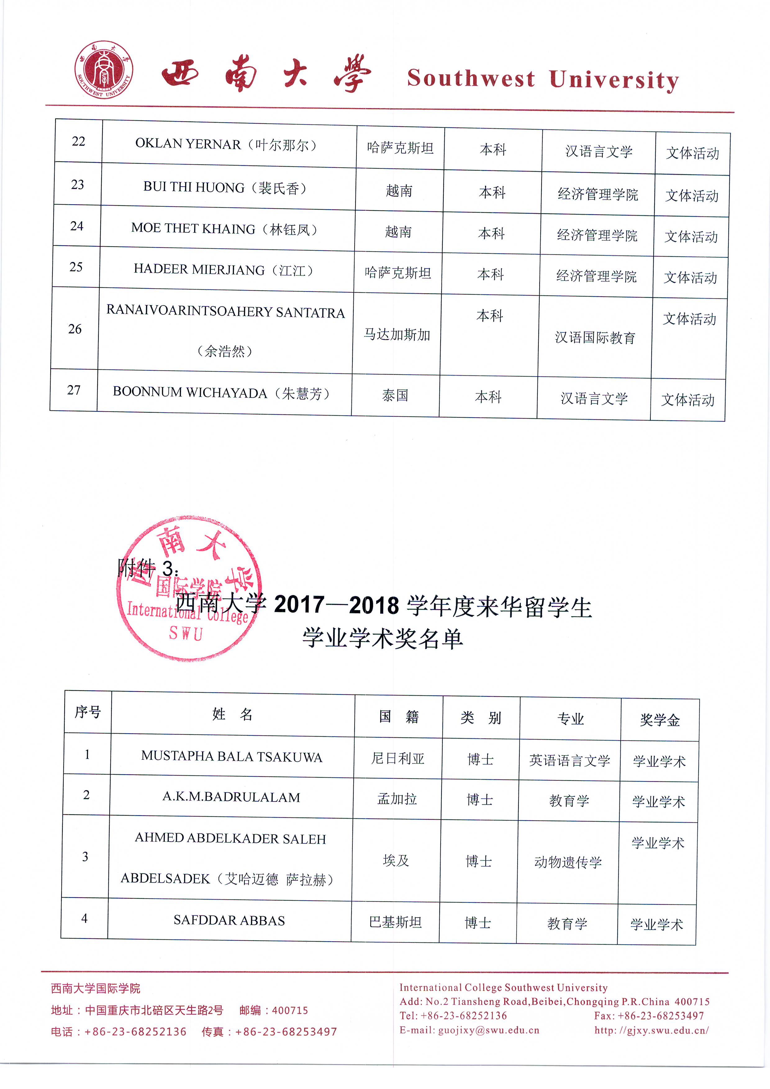 必赢776net2017-2018学年度优秀来华留学生奖学金、文体活动奖、学业学术奖评选公示