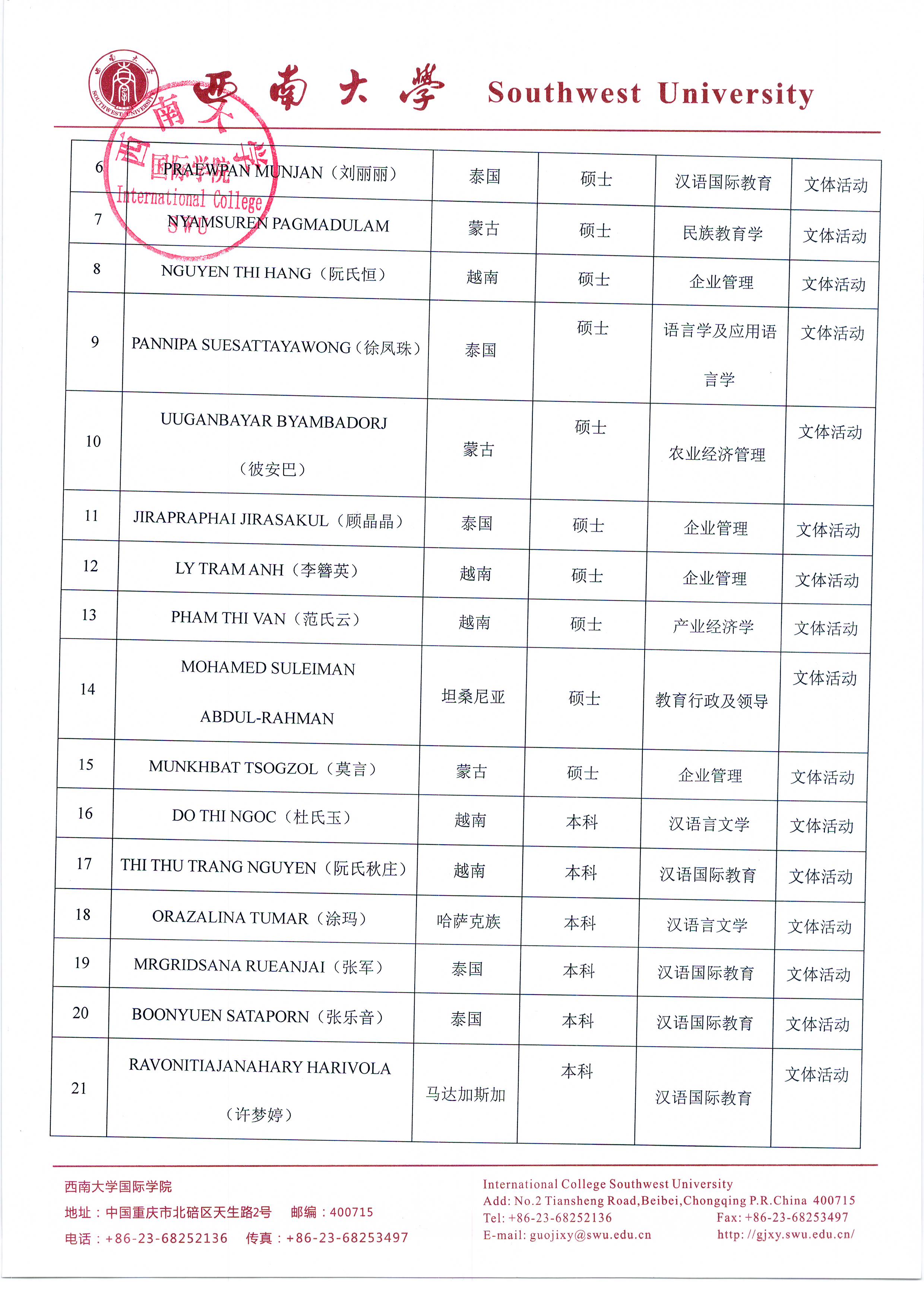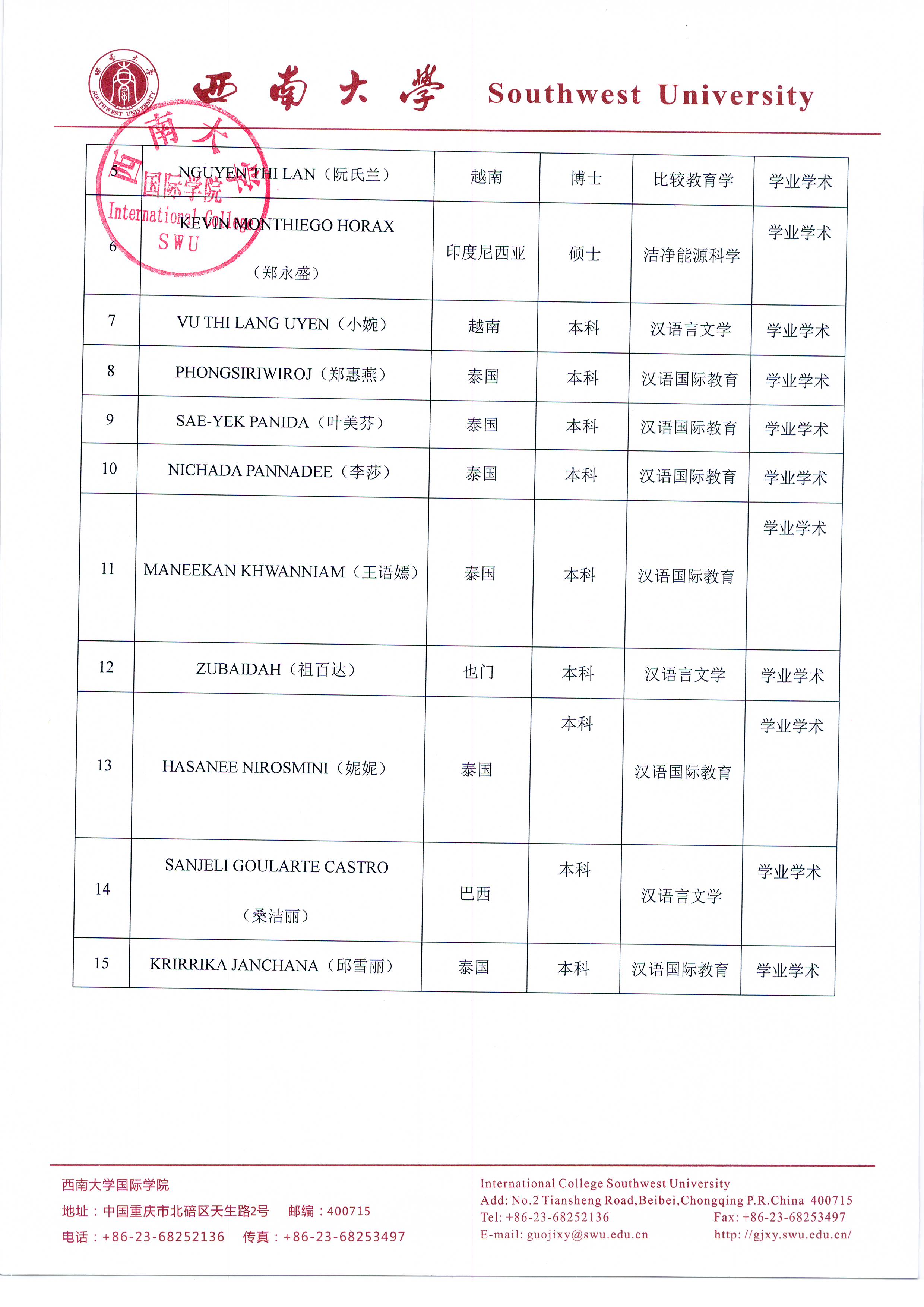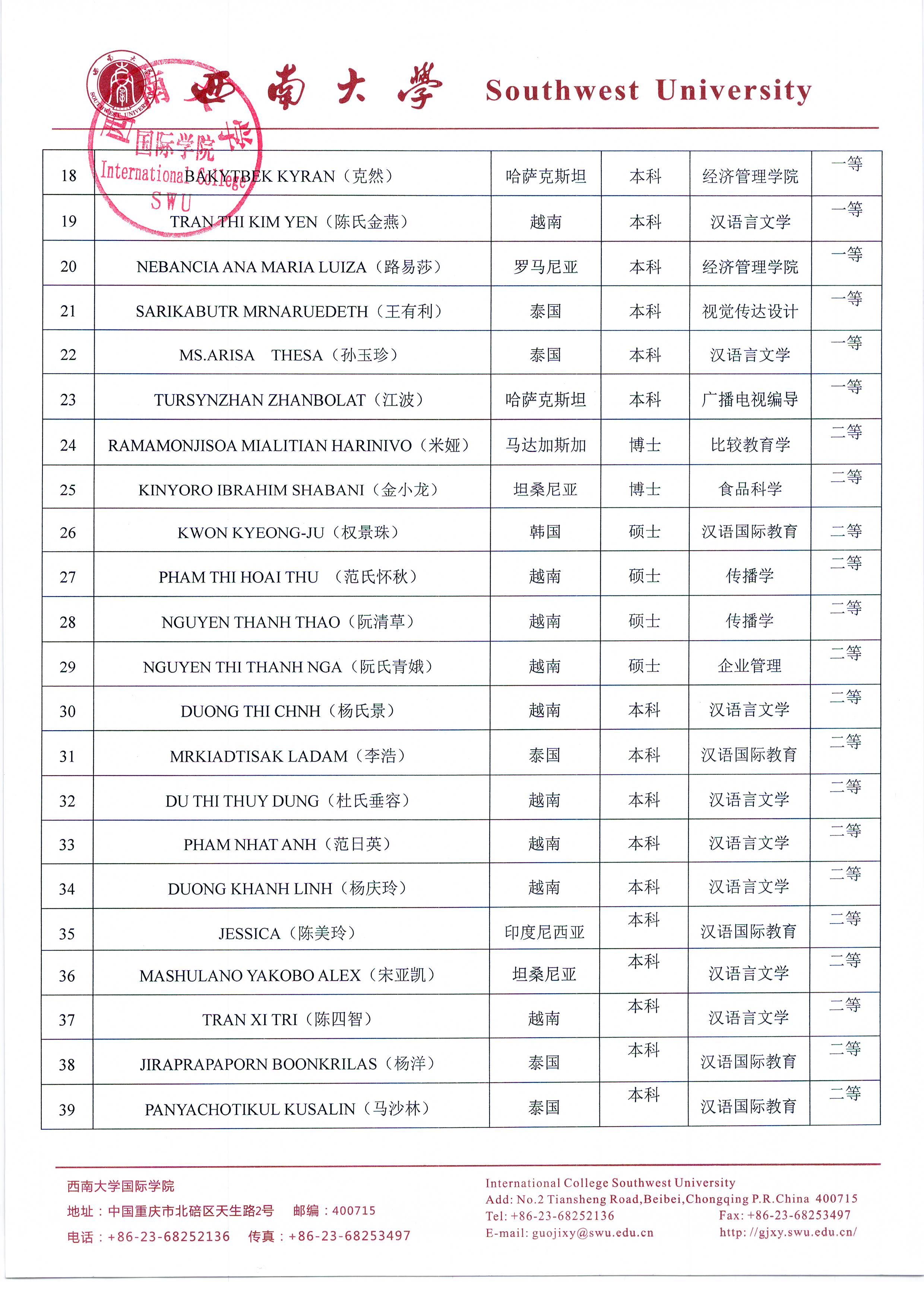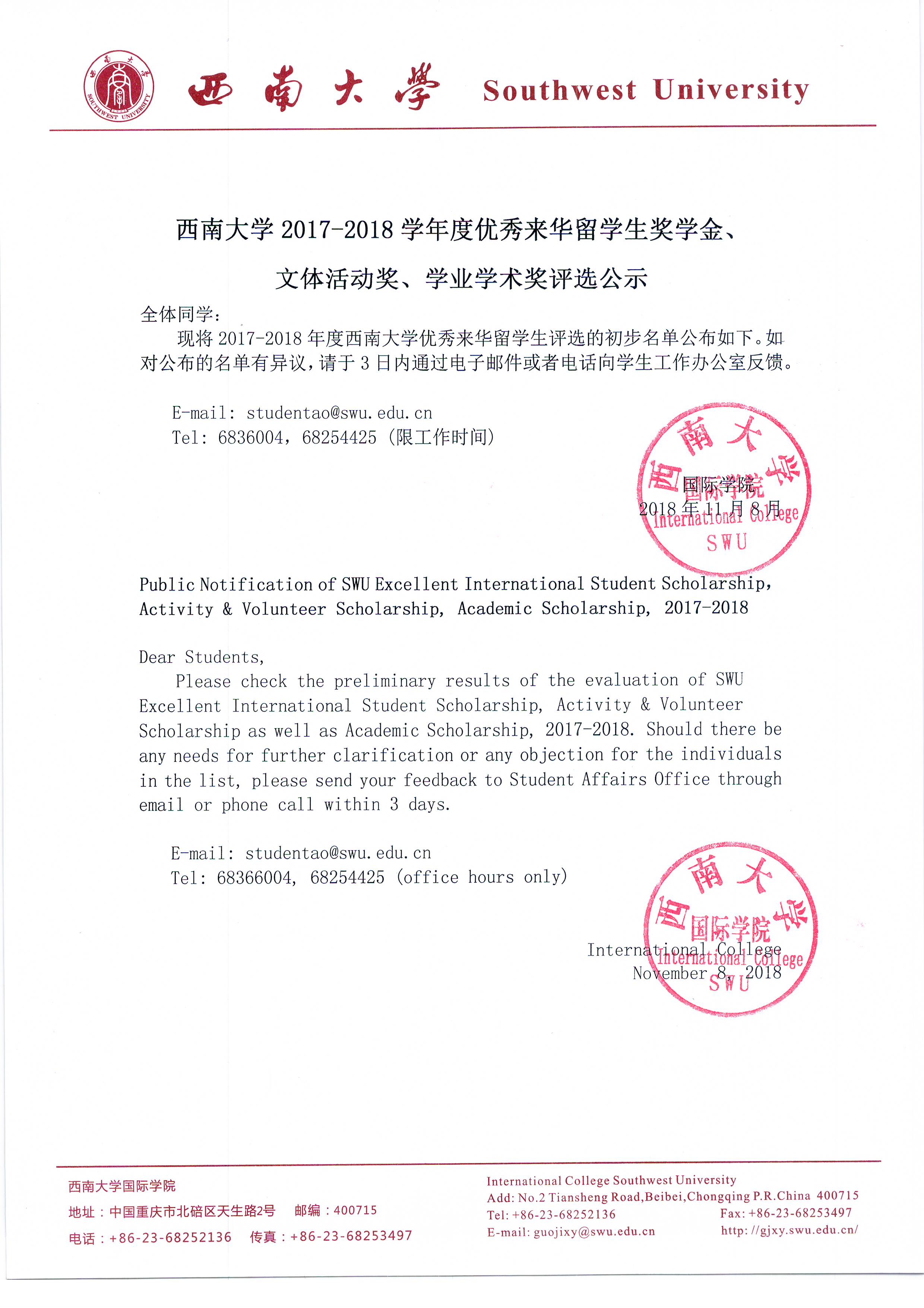 必赢776net2017-2018学年度优秀来华留学生奖学金、文体活动奖、学业学术奖评选公示