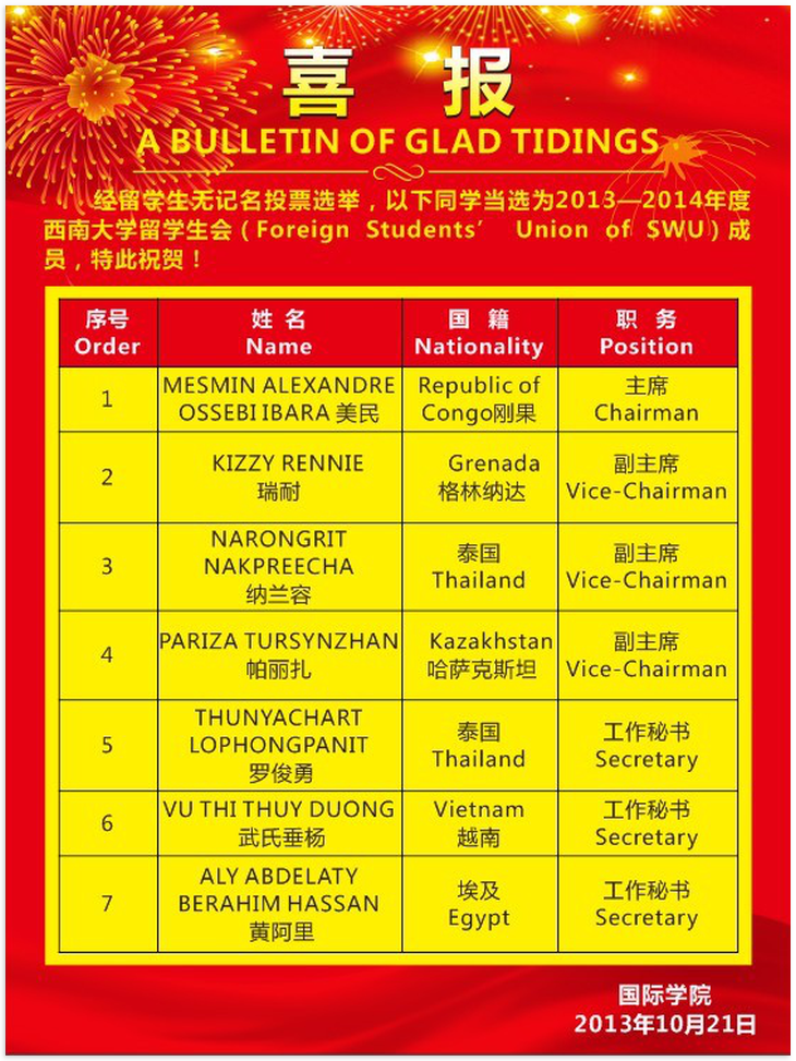 经留学生无记名投票选举,以下同学当选为2013—2014年度必赢776net留学生会(Foreign Students' Union of SWU)成员,特此祝贺!
