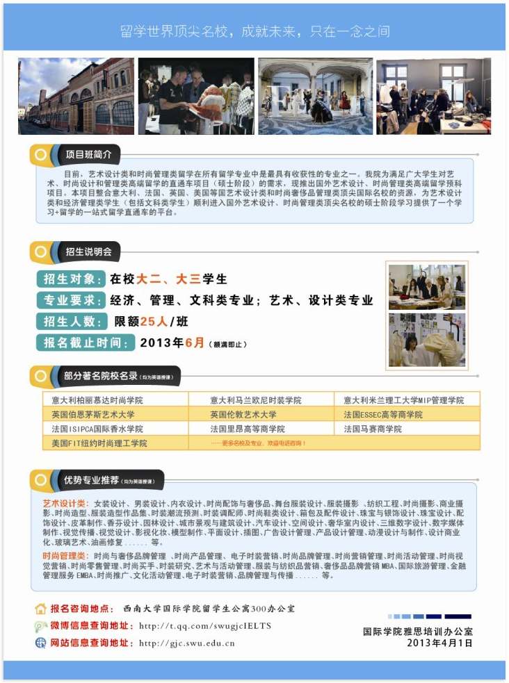 我处为满足广大学生对艺术、时尚设计和管理类高端留学的直通车项目(硕士阶段)的需求,现推出国外艺术设计、时尚管理类高端留学预科项目。本项目整合意大利、法国、英国、美国等国艺术设计类和时尚奢侈品管理类顶尖国际名校的资源,为艺术设计类和经济管理类学生(包括文科类学生)顺利进入国外艺术设计、时尚管理类顶尖名校的硕士阶段学习提供了一个学习+留学的一站式留学直通车的平台。
