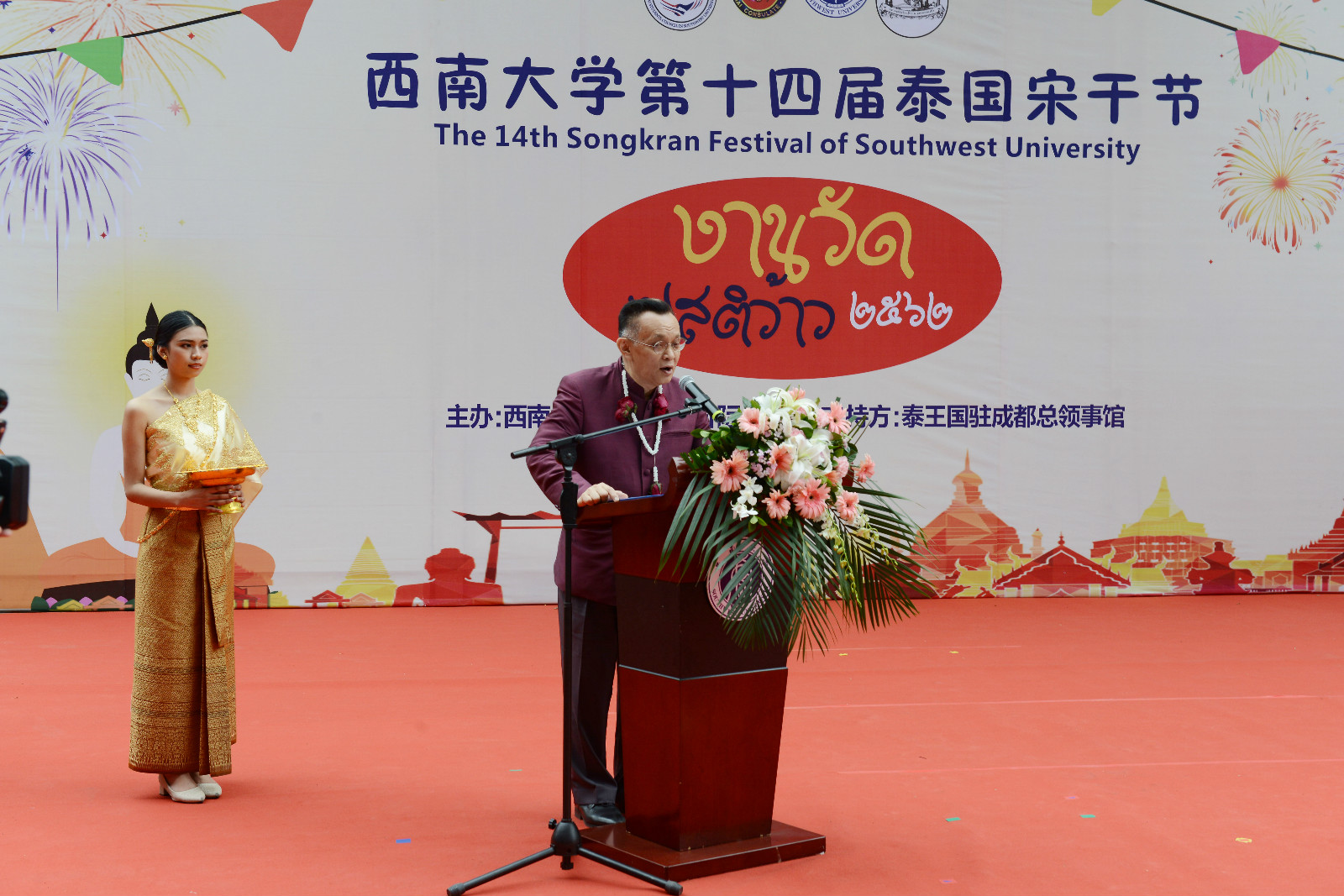4月10日下午,学校第十四届泰国宋干节举行。泰王国驻成都总领事馆总领事吴威德、重庆市公安局出入境管理局和北碚公安分局的有关领导、学校副校长靳玉乐,以及学校相关职能部门负责人应邀出席本次活动。中外师生500余人共同欢度泰历新年。