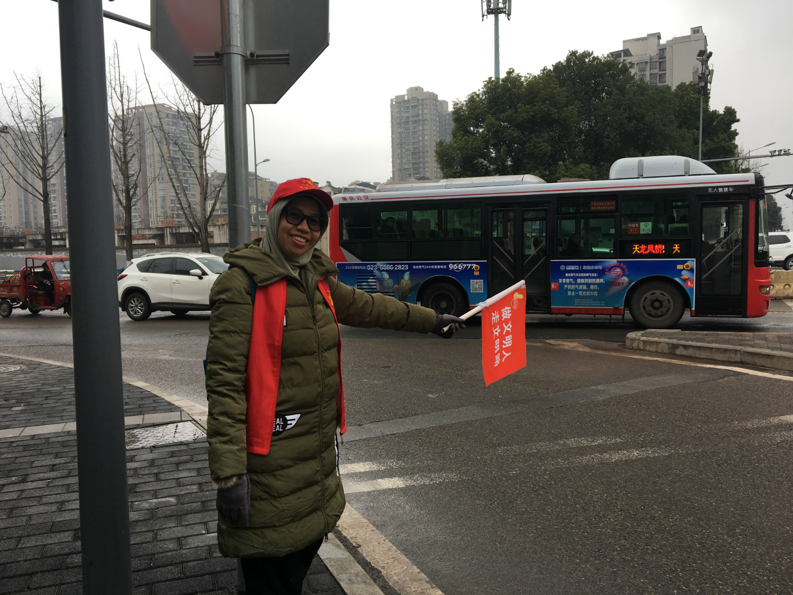 20名国际学生志愿者在活动现场担任了“一小时”交通文明劝导员,他们分布在万达广场周边的交通路口劝导市民遵守交通规则,文明出行。来自墨西哥的洛玲称,通过这次志愿活动,她感受到了文明交通的重要性,同时也为北碚市民在交通上体现出的良好素质点赞。