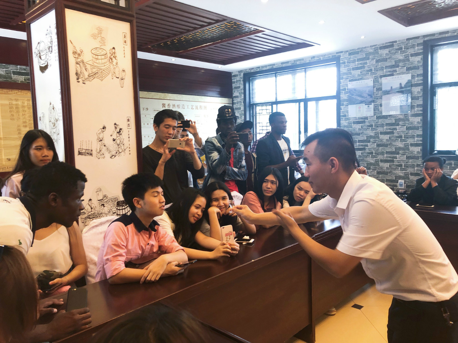 次日上午,在中国茅台镇酱香酒文化纪念馆,工作人员首先向同学们介绍了因孕育出国酒茅台酒而被誉为“中国第一酒镇”的茅台镇的悠久历史及其独特地理优势。随后同学们深入生产车间,参观酱香型白酒生产线,详细了解了酱香型白酒从发酵蒸馏到勾兑调配的独特酿造工艺。工作人员还邀请同学们品尝了几种不同年份的酱香酒,还为同学们讲解如何品鉴白酒。同学们在首次品尝到酱香突出,口感细腻的白酒后,纷纷用中文说道“好喝!”“与平时喝的啤酒完全不一样”。随后,同学们来到纵贯千年历史的中国酒文化城参观,馆内大量文物史料展示了中国博大精深的酒文化及源远流长的国酒文化,让同学们从不同角度更加深入地了解了中国历代酒业的发展过程及文化民俗。