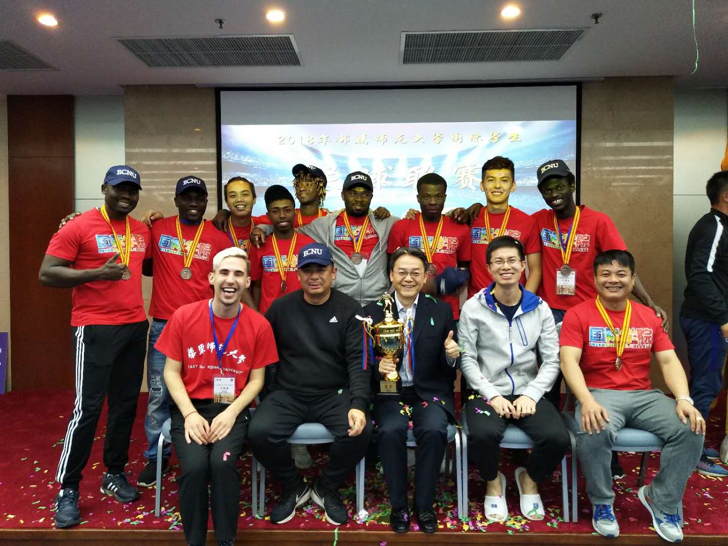晚上6点,比赛闭幕式在华东师范大学"教师之家‘’三楼会议室隆重举行。学校荣获季军奖杯,全体球员、教练和领队从东道主华东师范大学国际教育中心主任黄美旭手中接过奖杯和奖牌。