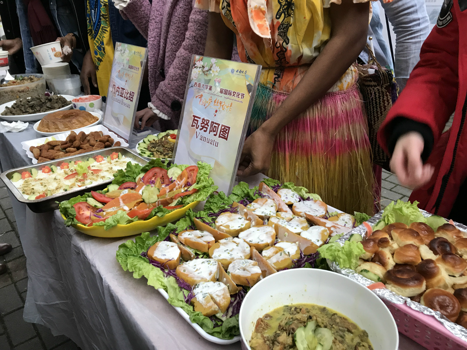 据了解,此次世界美食展区共汇集了39个国家的特色美食。所有美食都由留学生亲手制作,如阿尔及利亚的土豆鸡肉拼盘Sfirya、日本的日式火锅、蒙古的鸡肉饼、巴西葡萄汁、印尼炸香蕉等等,各种传统美食、饮品齐上阵。经过精心梳妆、身着传统服装的国际学生们与各具特色的美食一同展示着属于他们民族的风姿。