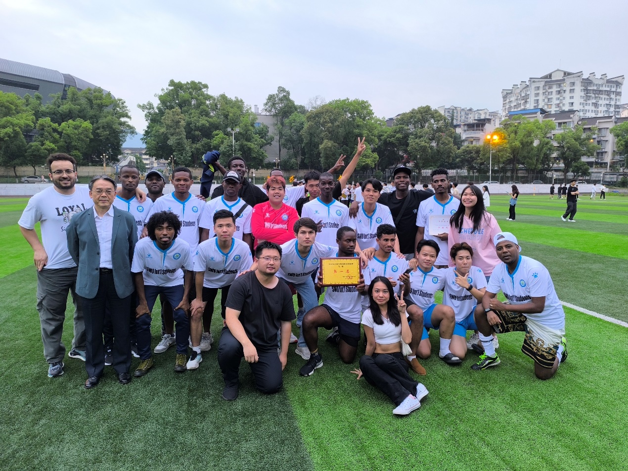 颁奖仪式在学校第三运动场隆重举行,赛事主办方向学校国际学生足球队颁发奖杯。球队苏丹籍国际学生MOHAMMED HASSAN ALI ALAGHIB(中文名:丁子家),以4粒进球荣获联赛(乙组)“金靴奖”。
