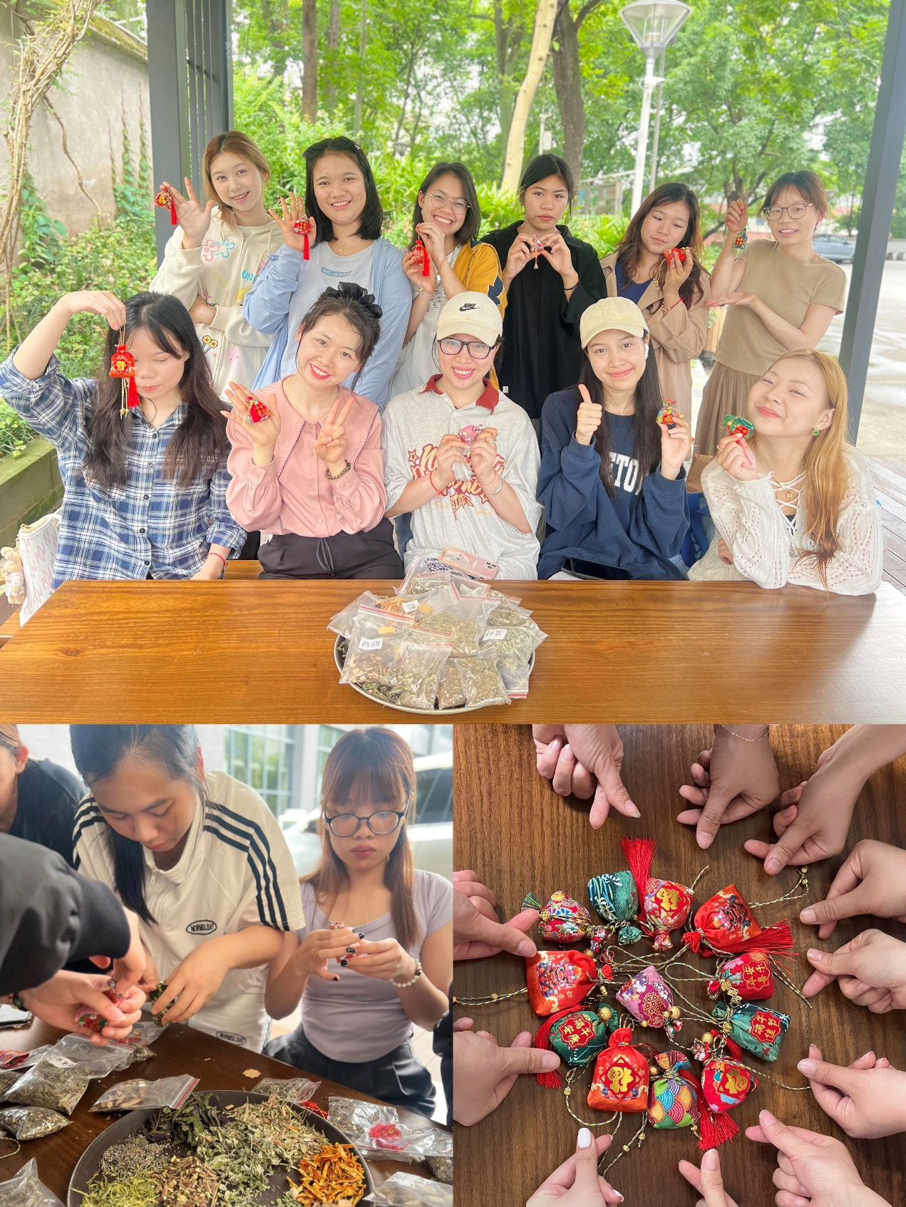 在中国传统文化中,端午节佩戴香囊不仅是一种习俗,更是一种祈福的方式。返校后,22级中国汉硕生王曼曼向来华留学生介绍了端午节佩戴香囊的传统意义,讲述了香囊在中国传统文化中的重要地位。随后,详细演示了如何制作香囊。同学们迫不及待地动手操作,纷纷加入到了香囊制作的行列中:拿起香囊的材料,听完老师讲解后,大家学会选材、填充、收口等步骤,开始穿针、引线、打结、挂珠串儿、装香料、封口,丝丝线线缠绕出对端午祥和、生活安康的美好祝愿。