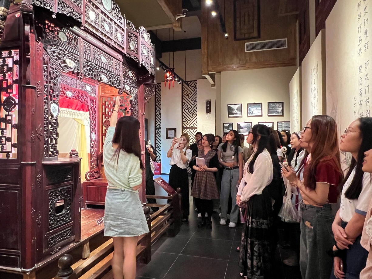 第二站走进巴渝民俗博物馆古床展馆,在巴渝民俗博物馆王黎老师的讲解下,国际学生领略了巴渝地区木雕家具的艺术魅力,感受到了底蕴深厚的巴渝传统文化。国际学生在老师的指引下,依次参观馆中陈列的清代中晚期至民国时期巴渝地区精美雕花大床及家神龛等展品等等。面对一张张金碧辉煌的雕花大床,国际学生们对其精致的设计、精美的工艺赞叹不已,还纷纷提出心中的疑问,并了解古床的发展历程、制作工艺、不同雕花纹样在中国的寓意等。