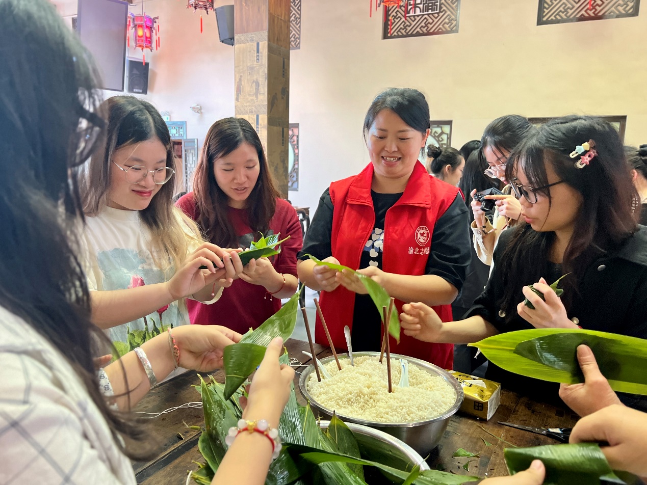 在节日民俗体验环节,巴渝民俗博物馆联合滨港路社区居民委员会组织了一场别开生面的包粽子活动。在社区志愿者的耐心指导下,国际学生们了解了粽叶和糯米的功用。在欢声笑语中,同学们认真实践着从折粽叶、填糯米,到捆绑线绳的每一个步骤。很快,一个个精巧可爱的粽子就出现在了桌子上。