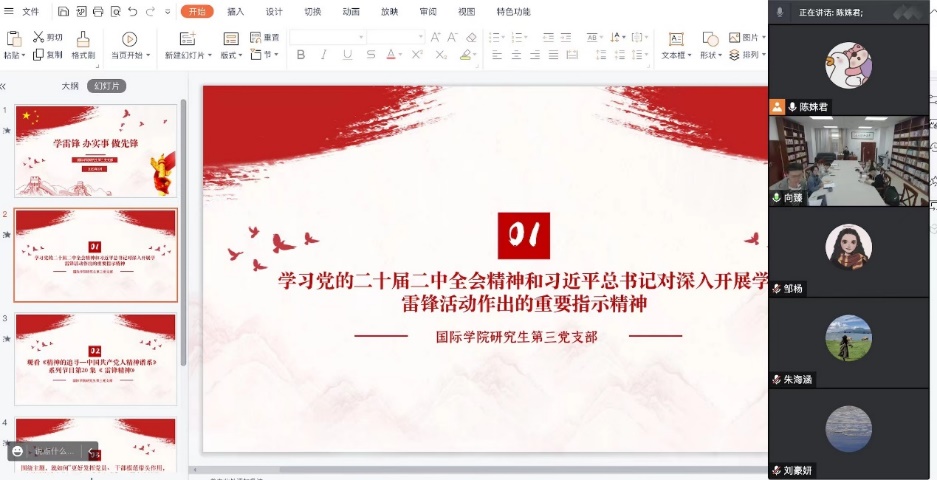 恰逢3月5日“学雷锋纪念日”的到来,必赢776net研究生第三党支部于9日下午三点召开以“学雷锋,办实事,做先锋”为主题的党日活动。本次活动以线上与线下相结合的方式举办,支部全体党员和积极分子共同参与。