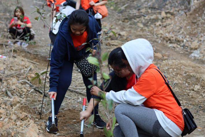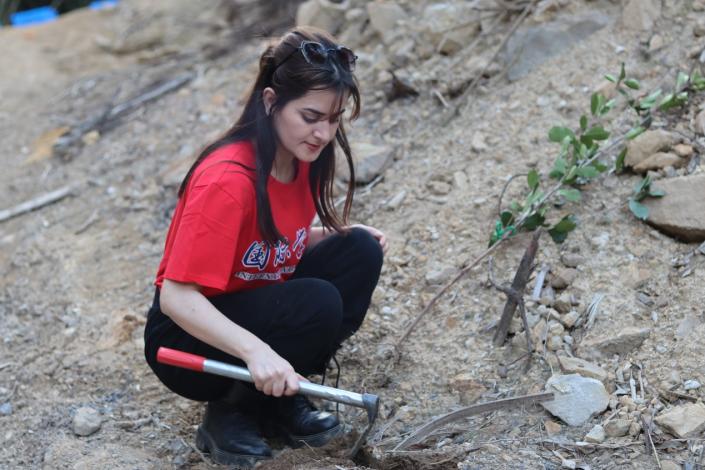 在工作人员的指导下,老师和同学们用铁铲在指定位置,挖开表面碎石,刨土、放苗、回填,压实……一起种下象征希望的树苗,期待它们茁壮成长,早日为缙云山生态修复增添一份绿色。