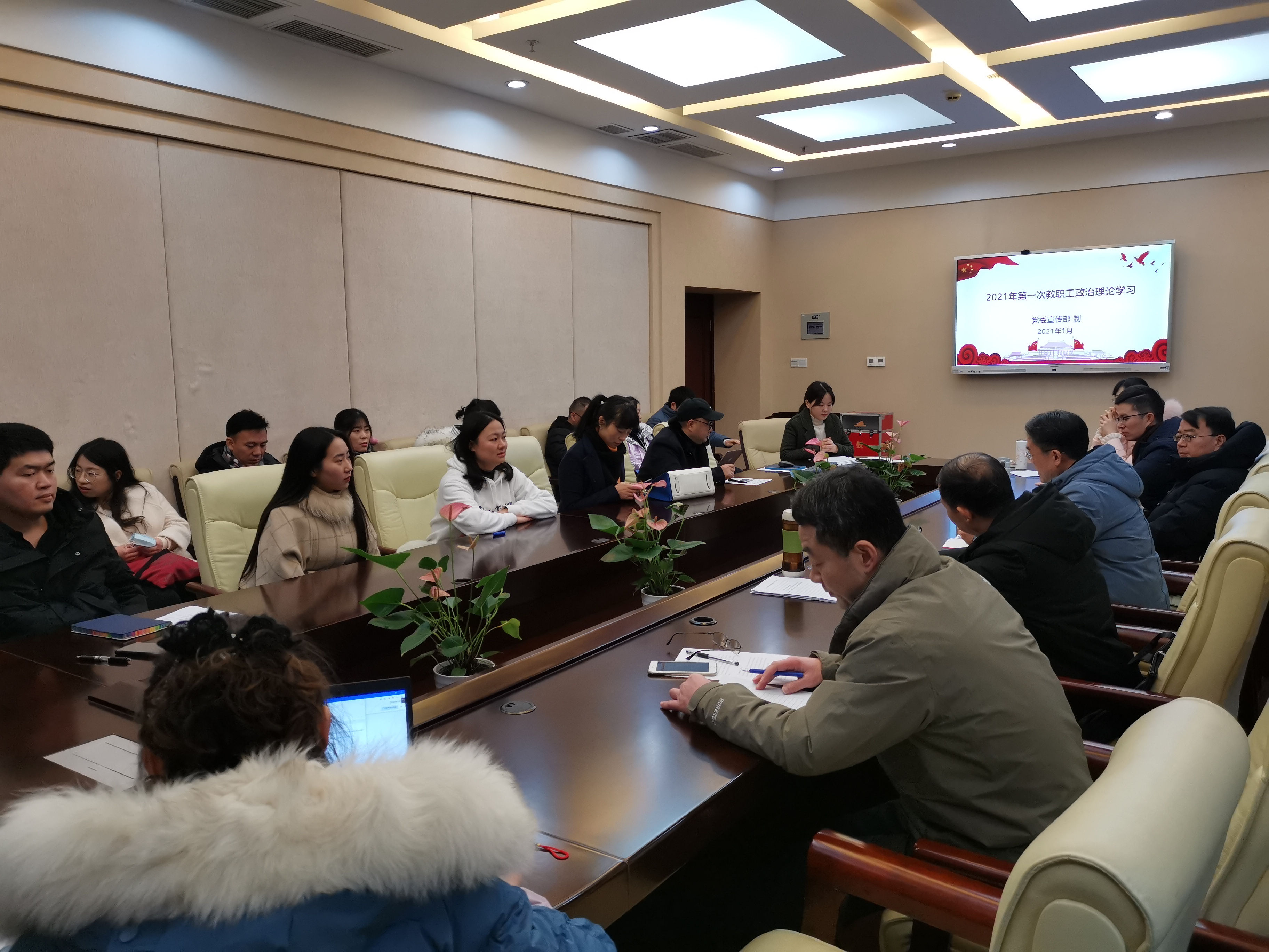 2021年1月8日下午3点,必赢776net全体教职在紫云楼签约室开展本年度第一次政治理论学习活动,会议由刘猛书记主持。