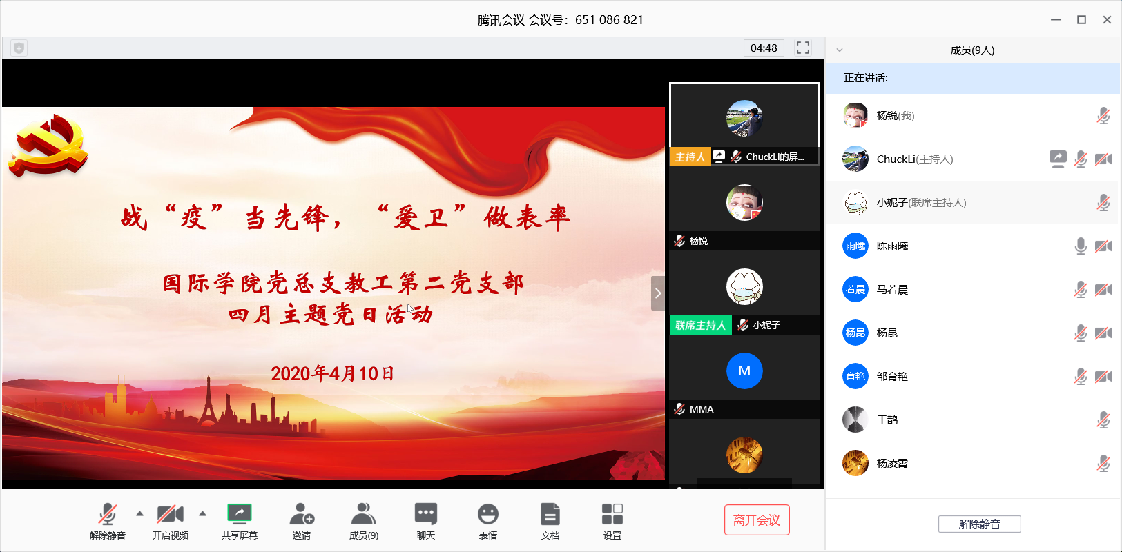 4月10日下午,教工二支部在线举行了“战‘疫’当先锋 ‘爱卫’做表率”的主题党日活动。刘燕妮同志首先带领全体党员导学了《国家记忆》之《爱国卫生运动六十五年》专题纪录片的有关内容。邹育艳和马若晨同志分别进行了交流发言。 他们表示当今世界正在面临百年未遇之大变局,疫情对于我们既是挑战,又是机遇。我们经受住了挑战,同时向世界展示了强大的组织协调能力、国力、凝聚力。随后,李林泽同志对《习近平给北京大学援鄂医疗队全体90后党员的回信》和《动员广大群众积极参与爱国卫生运动的倡议书》的有关内容进行了导学,杨凌霄和何汉儒同志分别就北碚地方医院参与援鄂情况和必赢776net前台保安人员在抗疫中的先进事迹分享了自己的心得体会。最后,支部为4月份入党的何汉儒和邹育艳两名同志过了政治生日。