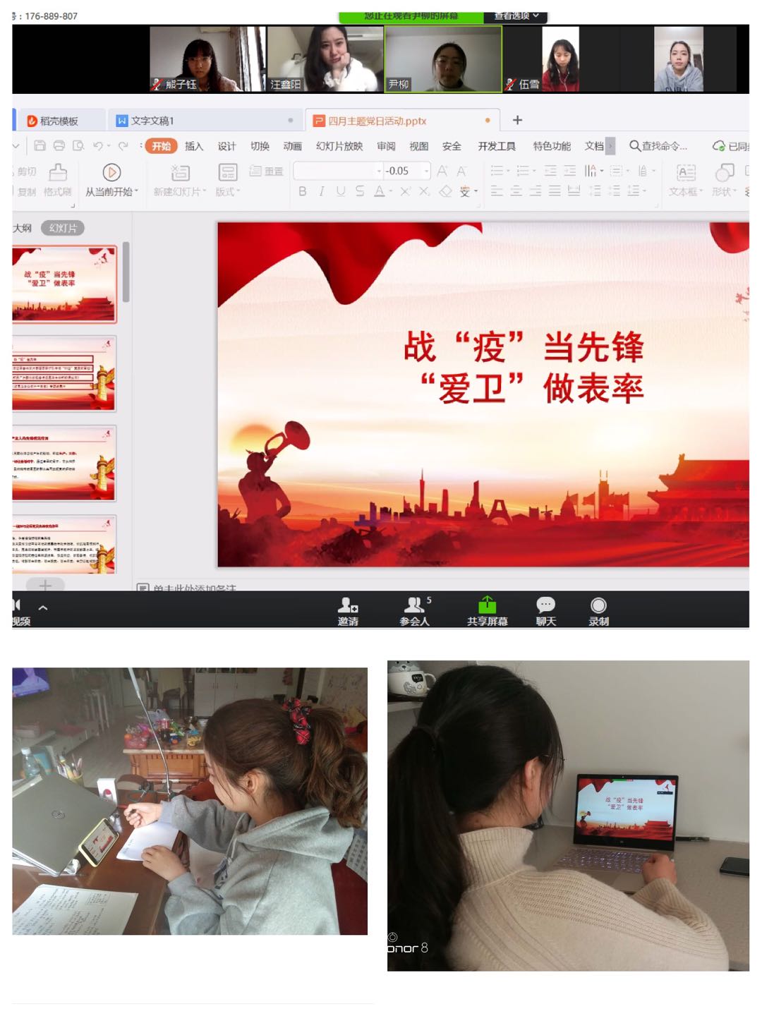 为深入学习贯彻习近平总书记关于新冠肺炎疫情防控工作的重要指示精神,2020年4月10日下午3:00,教工一支部通过腾讯会议开展主题为“战“疫”当先锋,“爱卫”做表率 ”的主题党日活动。