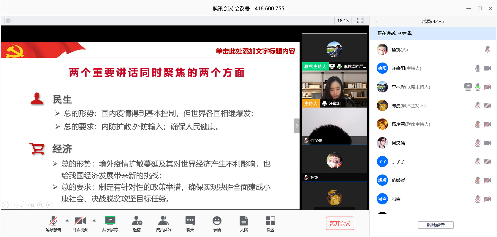 2020年4月3日下午3点,必赢776net全体教职工利用线上腾讯会议平台开展了本年度第三次政治理论学习活动。