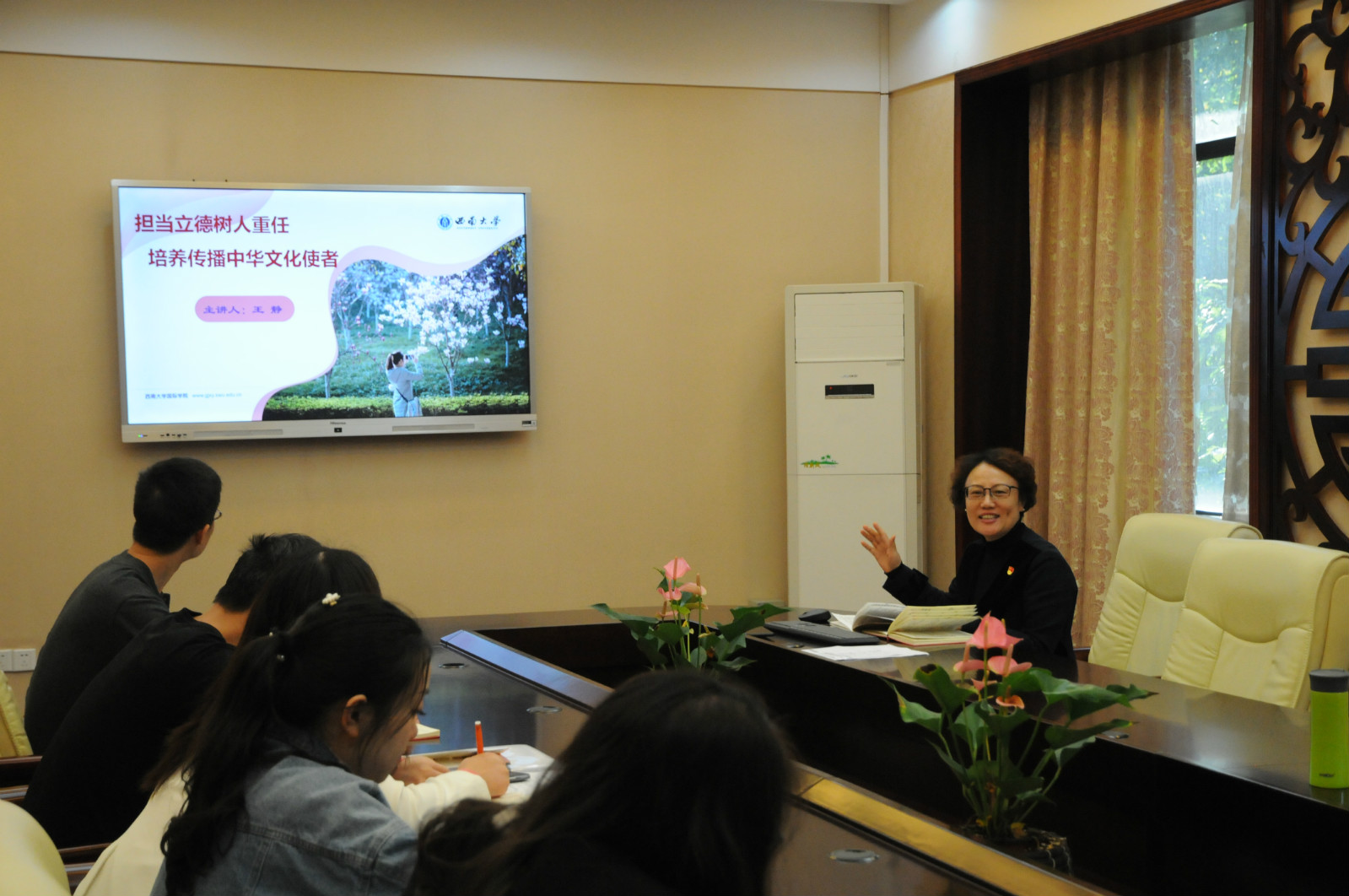 10月18日下午3点在紫云楼签约室,教工第二党支部开展立德树人根本任务“大学习,大讨论,大落实”主题党日活动。院长王静同志讲述了题为《担当立德树人重任 培养传播中国文化使者》的党课。王静院长首先阐释了立德树人的内涵是培养德智体美劳全面发展的人。立德树人的重要意义是培养有“中国心”“中国情”“中国味”的新人,使党的事业后继有人,这关系到党和国家的命运。接着,她介绍了必赢776net作为来华留学生培养单位,面对培养对象要立不同的“德”,树不同的“人”。要面向来华留学生讲好中国优秀传统文化、充分展示“四个自信”、讲清楚中国共产党为什么”能“、马克思主义为什么“行”、中国特色社会主义为什么“好”等留学生关注的问题。