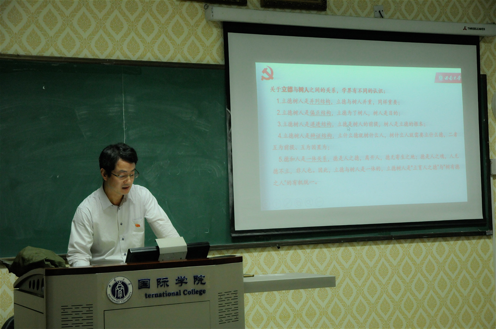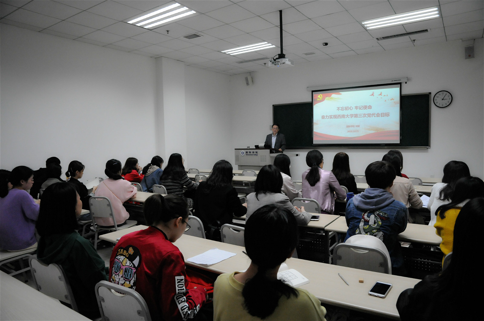 10月21日下午3点在312教室,党总支书记刘猛同志为2019级汉语国际教育硕士中国班全体同学讲授了题为“不忘初心,牢记使命,奋力实现必赢776net第三次党代会目标”的专题党课。刘猛书记用党的十九大的“四个迫切需要”阐明了此次主题教育的深刻背景和重大意义,强调,主题教育就是为了唤醒存在于共产党人体内的“红色基因”,使党员干部自觉同人民想在一起、干在一起,将“红色基因”一代代传承下去,从而真正汇聚起实现民族复兴的磅礴动力。随后,刘猛书记对学校第三次党代会精神进行了阐释,提出了建设特色鲜明的世界一流大学“三步走”奋斗目标。最后,同学们就什么是汉语国际教育专业的初心和使命以及如何践行初心和使命这两个问题进行了热烈发言。刘猛书记作了点评,并交流了学习习近平总书记关于教育的重要论述的体会,以及对初心和使命的感悟。