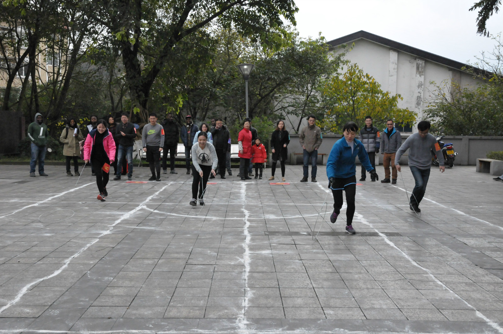 “铁人三项”(滚铁环、转呼啦圈和运乒乓球)让大家找回了童年的记忆,年纪长的老师亲手教年轻的老师滚铁环,平常没有转过呼啦圈的老师也努力摆动身体,给大家带来十足的“笑果”和满满的感动。“财源滚滚”各组站成一列,踩着象征吉祥的红色布带滚动向前,展现了团结一心、协作共进的势气。在chairball项目中,以两组对抗的形式,挑战着各组的体能和篮球技巧,也考验着团队协作能力。激烈的对抗引来观众阵阵呐喊,把趣味运动会的气氛推向了高潮。三分钟跳绳是全部项目中最轻松的,各组在跳绳一圈一圈地甩动中欢乐地蹦跳着,充分展示了大家的青春和活力。拔河比赛作为压轴大戏,交战双方寸土不让,双方拉拉队也开足火力,参赛队员面部狰狞的表情、爆出的青筋和胜利后激动的欢呼,充分展示了学院不畏艰难、奋力拼搏的精神。