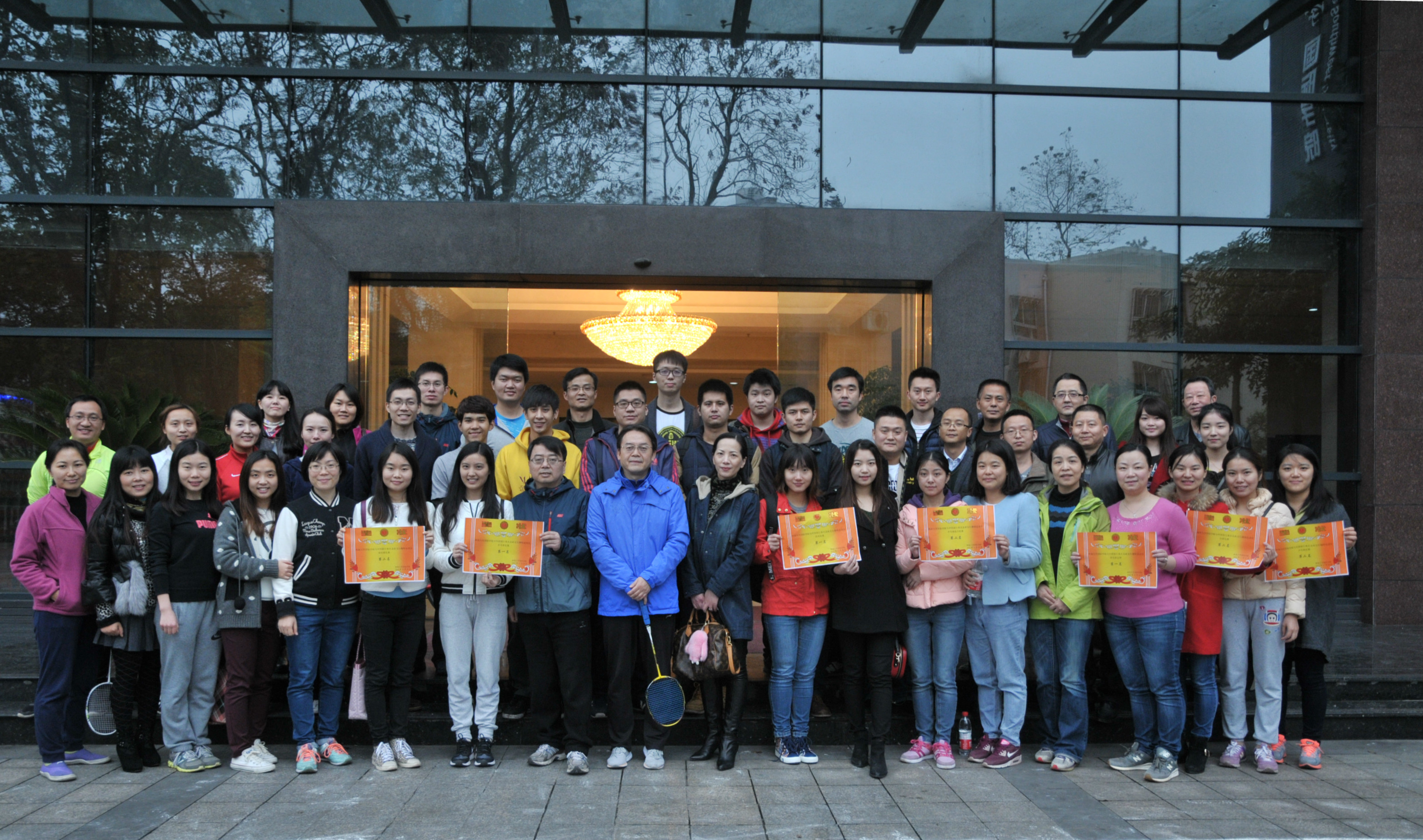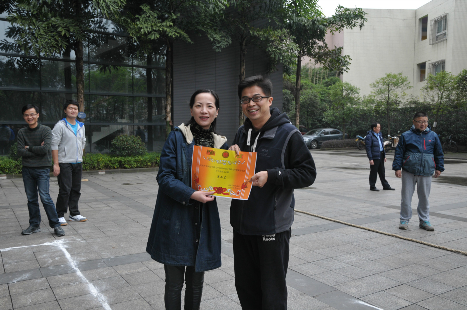 随着林千彭一个漂亮的击球,黑色8号球应声进洞,整场比赛落下帷幕。经过双方代表队激烈角逐和裁判们公正的评判,必赢776net代表队获得乒乓球迎面接力比赛、乒乓球项目和台球项目的一等奖,中国银行重庆北碚支行获得拔河比赛和羽毛球项目的一等奖。双方赛后在紫云楼前合影留念。