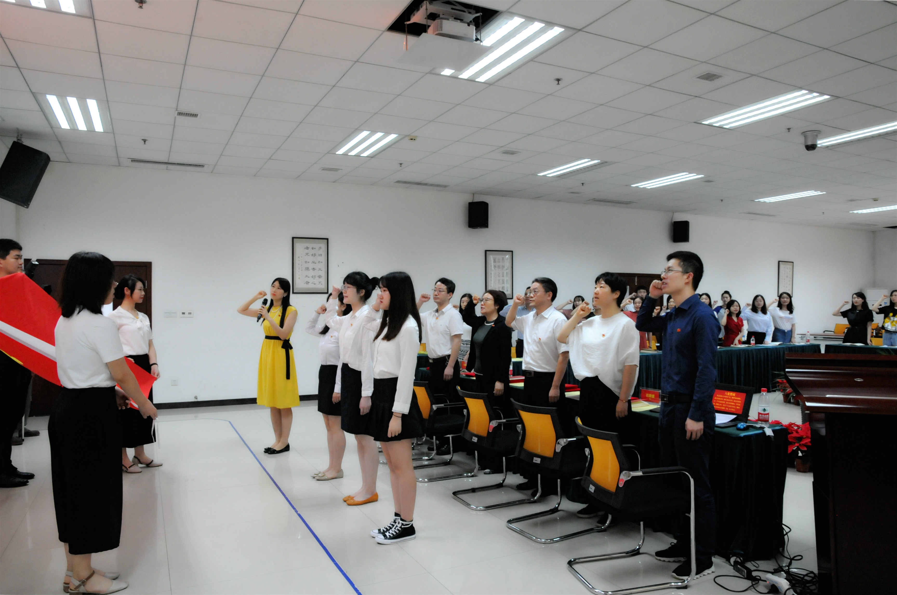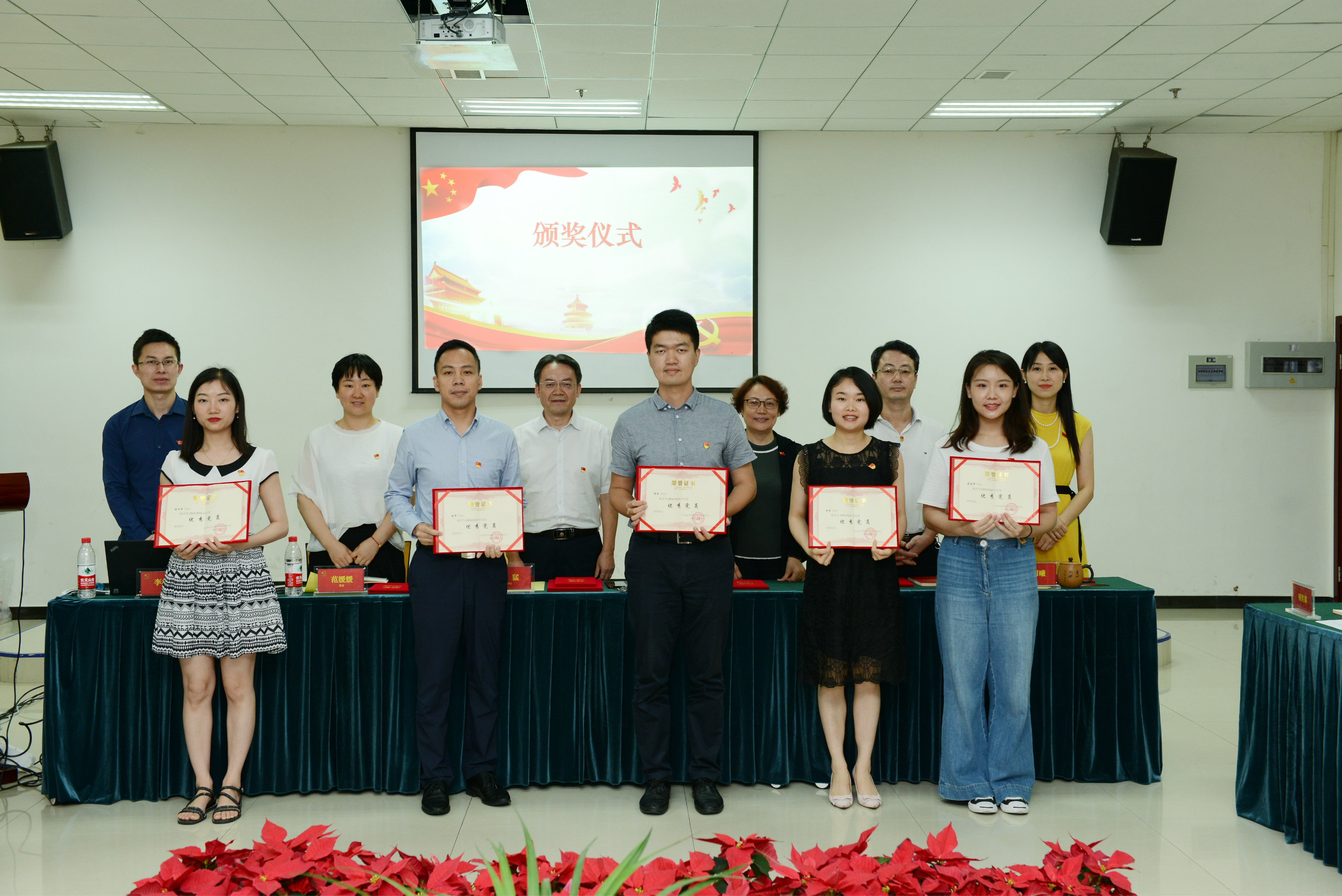 在庄严的国歌声中,本次大会拉开了序幕。首先进行的是新党员入党宣誓暨老党员重温入党誓词环节。在党旗前,三名新党员和全体老党员举起了右拳,庄严肃穆地宣读了入党誓言。随后,院长、党总支副书记王静同志宣读表彰决定。在主席台就坐的党总支委员、院领导为获奖的优秀党员、优秀党务工作者、先进党支部颁发了荣誉证书。