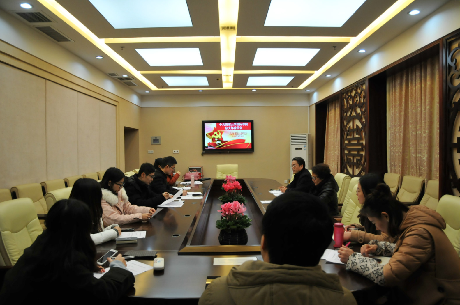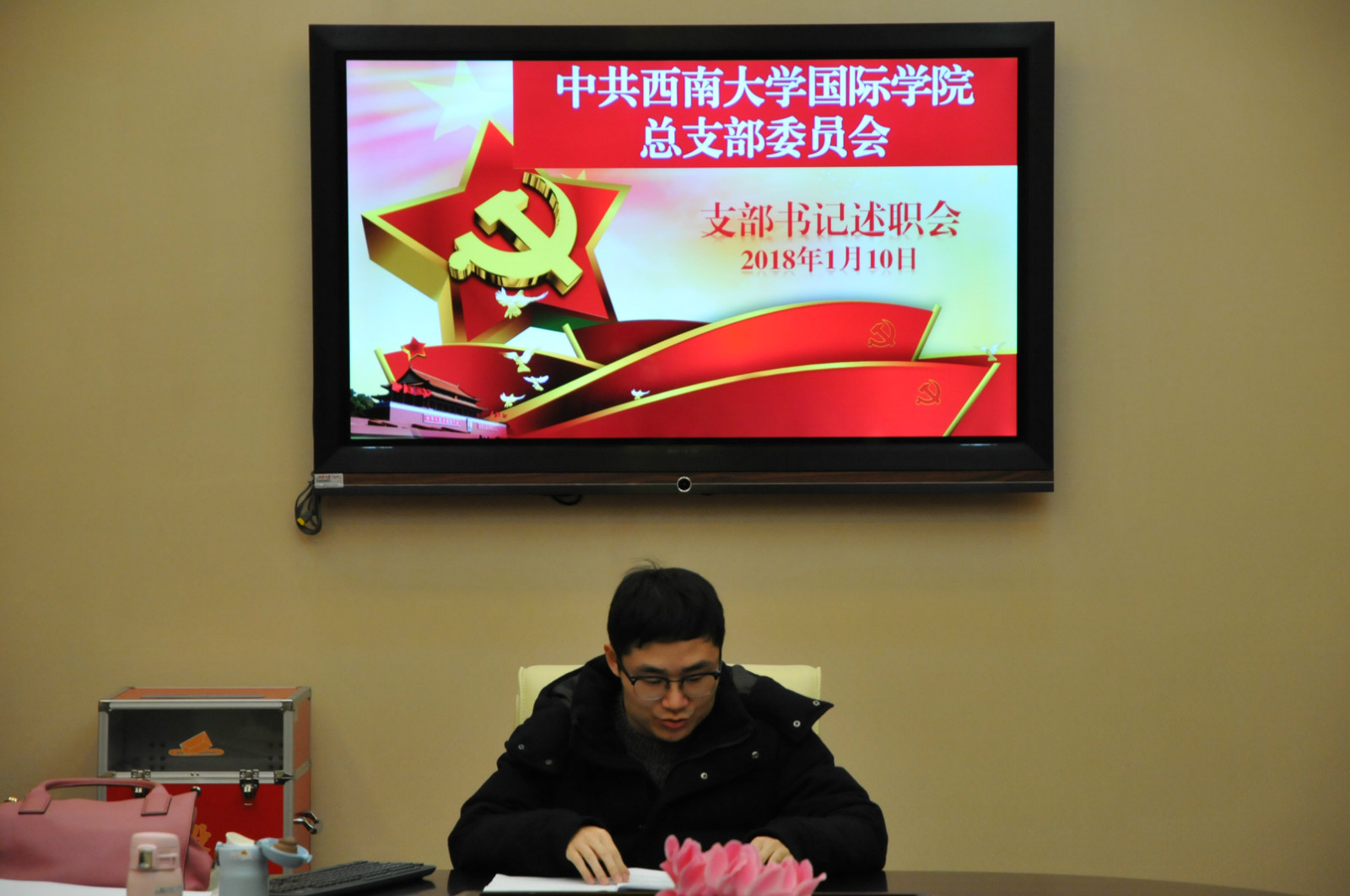 为推动全面从严治党向基层延伸,切实落实巡视整改任务,按照学校党委的要求,学院党总支于2018年1月10日下午3点在签约室,举行2017年支部书记年度述职评议会。党总支书记刘猛, 院长兼总支委员王静,以及四个支部的支部书记、支部委员,教师、学生党员代表参加会议,会议由刘猛书记主持。