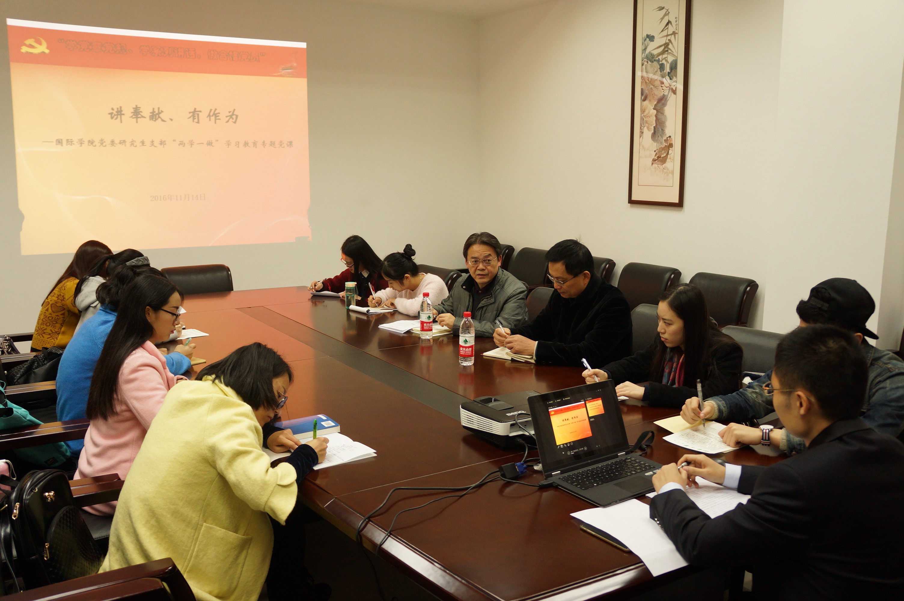 2016年11月14日下午3:00,国际学院党委研究生支部在304会议室举行了以“讲奉献、有作为”为主题的专题学习研讨会。学校党委研究生工作部部长尹晓东出席会议并讲话。学院党委刘猛书记以及支部全体党员(包括入党积极分子)参加组织生活会。会议由支部书记王湛明主持。
